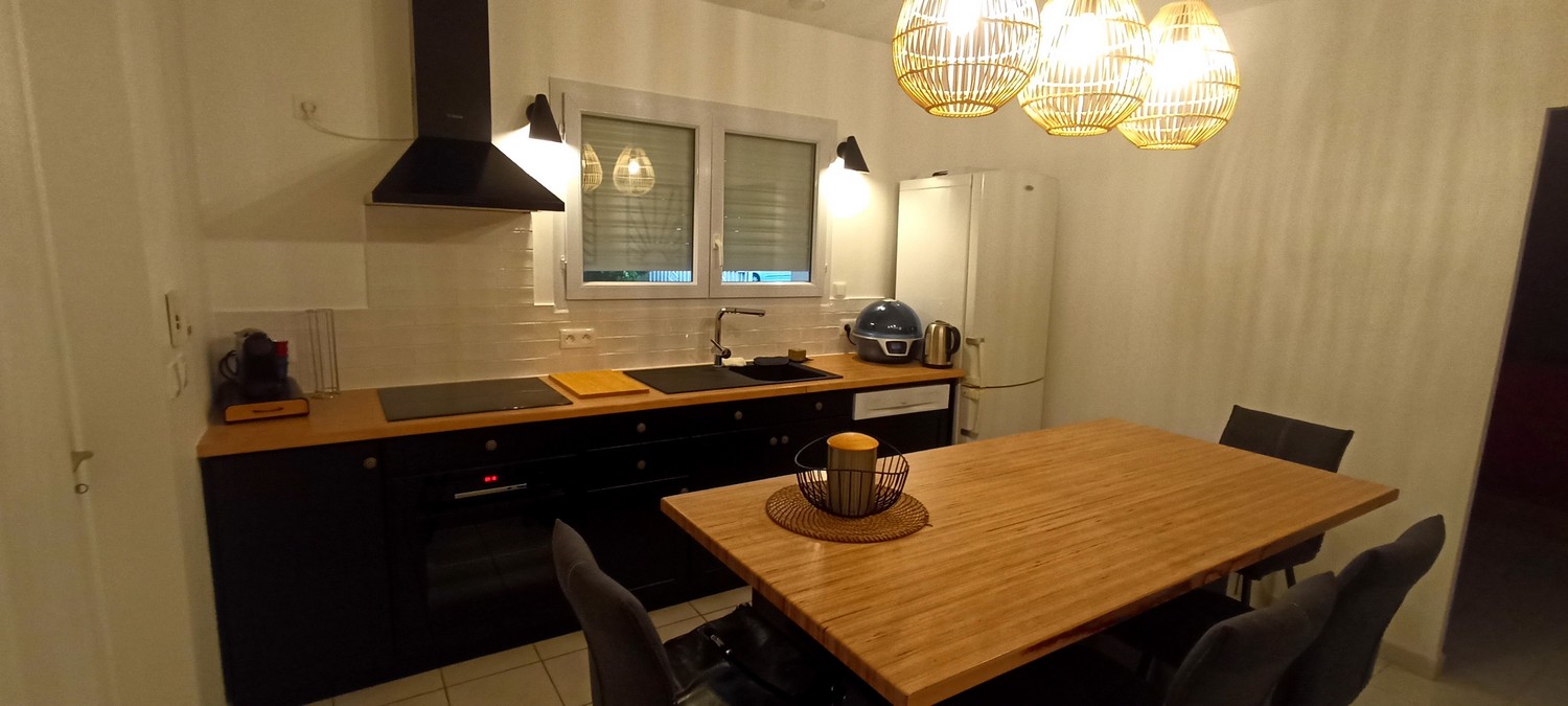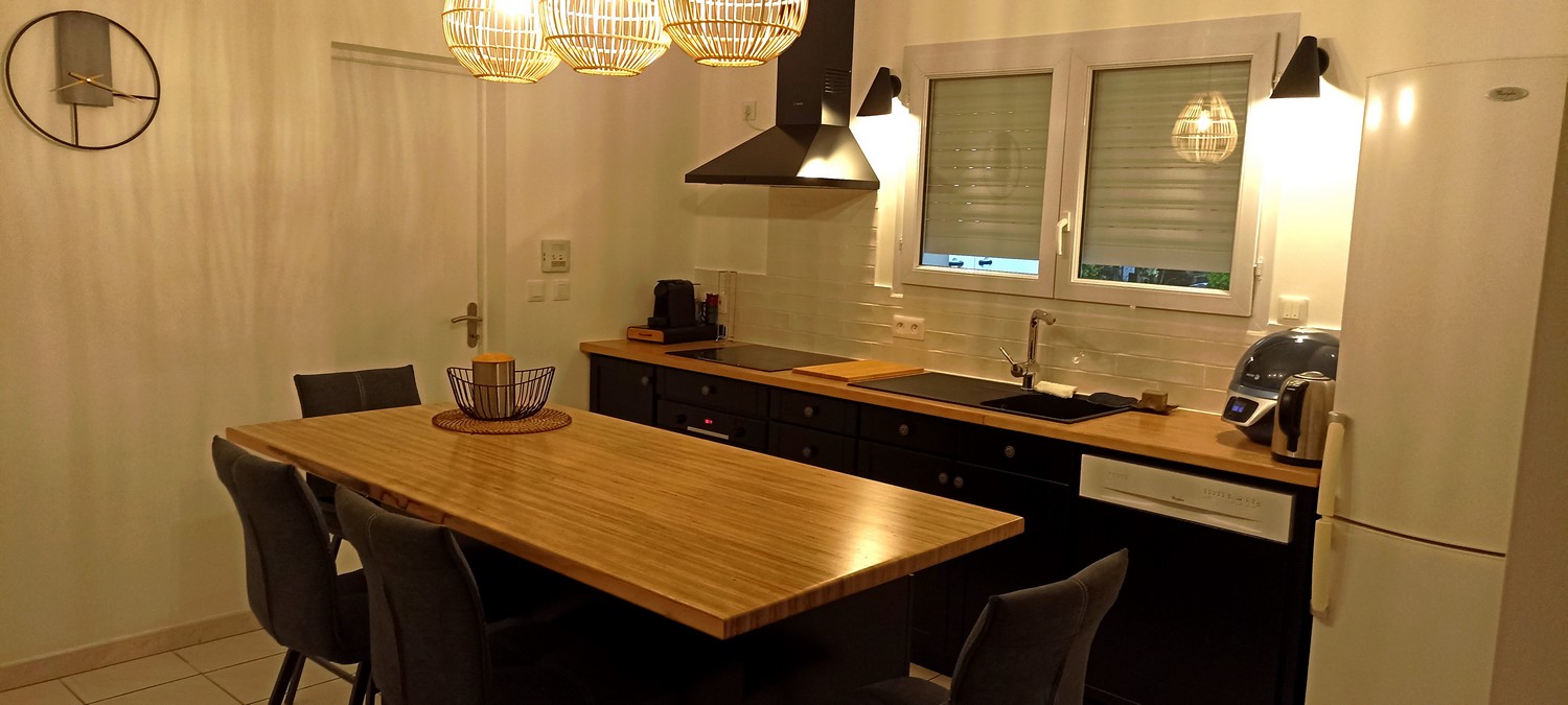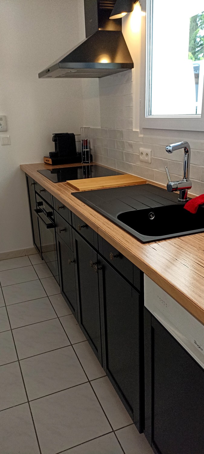 Face a une cuisine typique des années 90 dont les meubles étaient en bon état nous avons choisi de laquer les facades en noirs et de créer un ilot central. L’ensemble est lié avec un plan de travail en hêtre massif. L’ergonomie de la cuisine a été repensée : le frigo est déplacé dans le prolongement du plan de travail. Un grand placard "toute hauteur" prends sa place. |