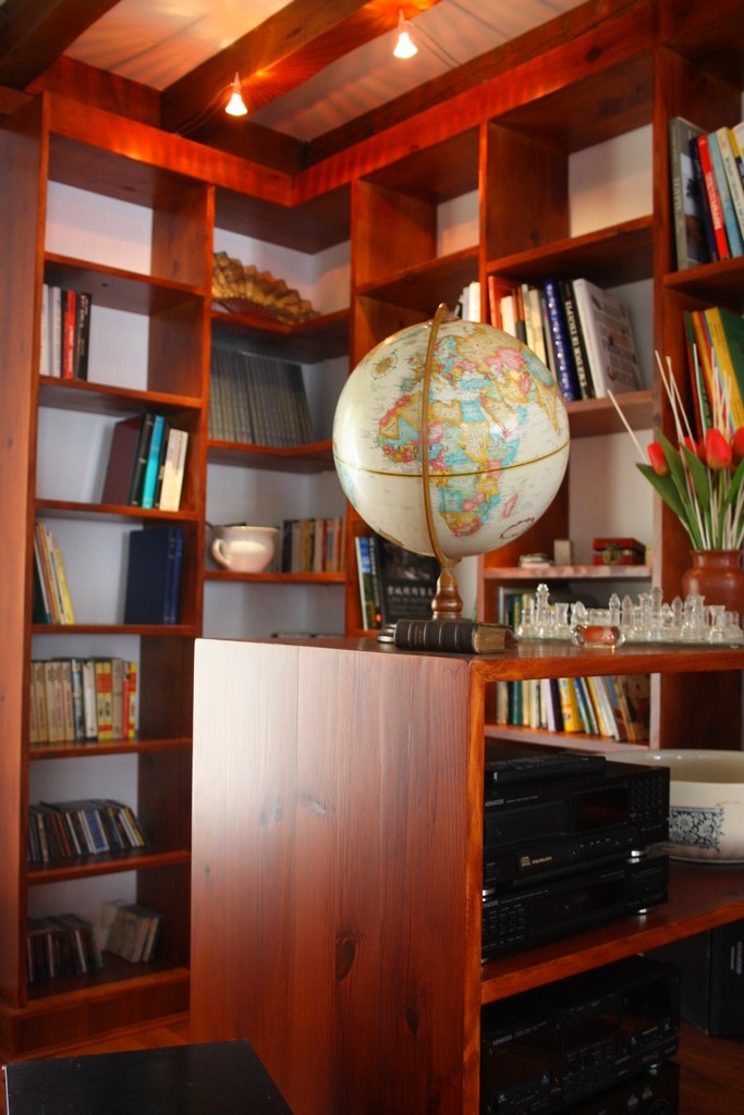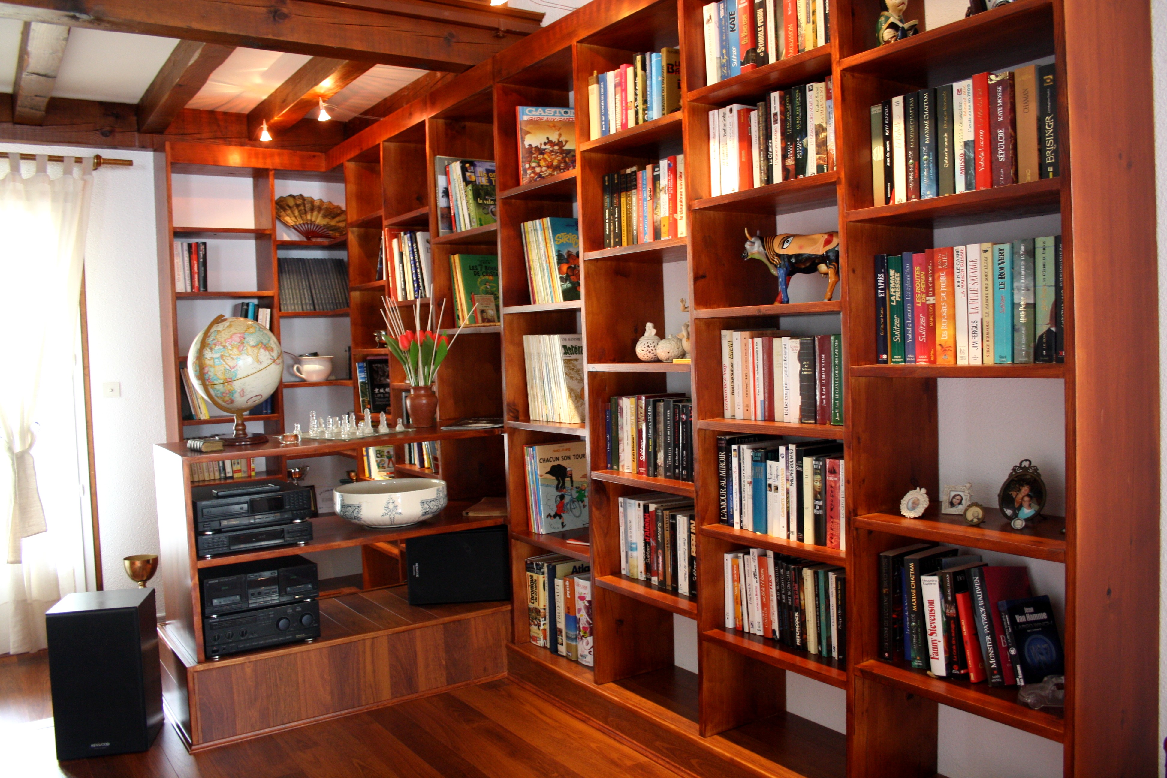 La bibliothèque proprement dite, à été pensée comme un véritable meuble en bois teinté merisier, composée de 13 modules d'étagère, une partie tablette au dessus d'un des bac à fleurs. Des petits spots sur col de cygne vienne donner du volume à l'ensemble.!