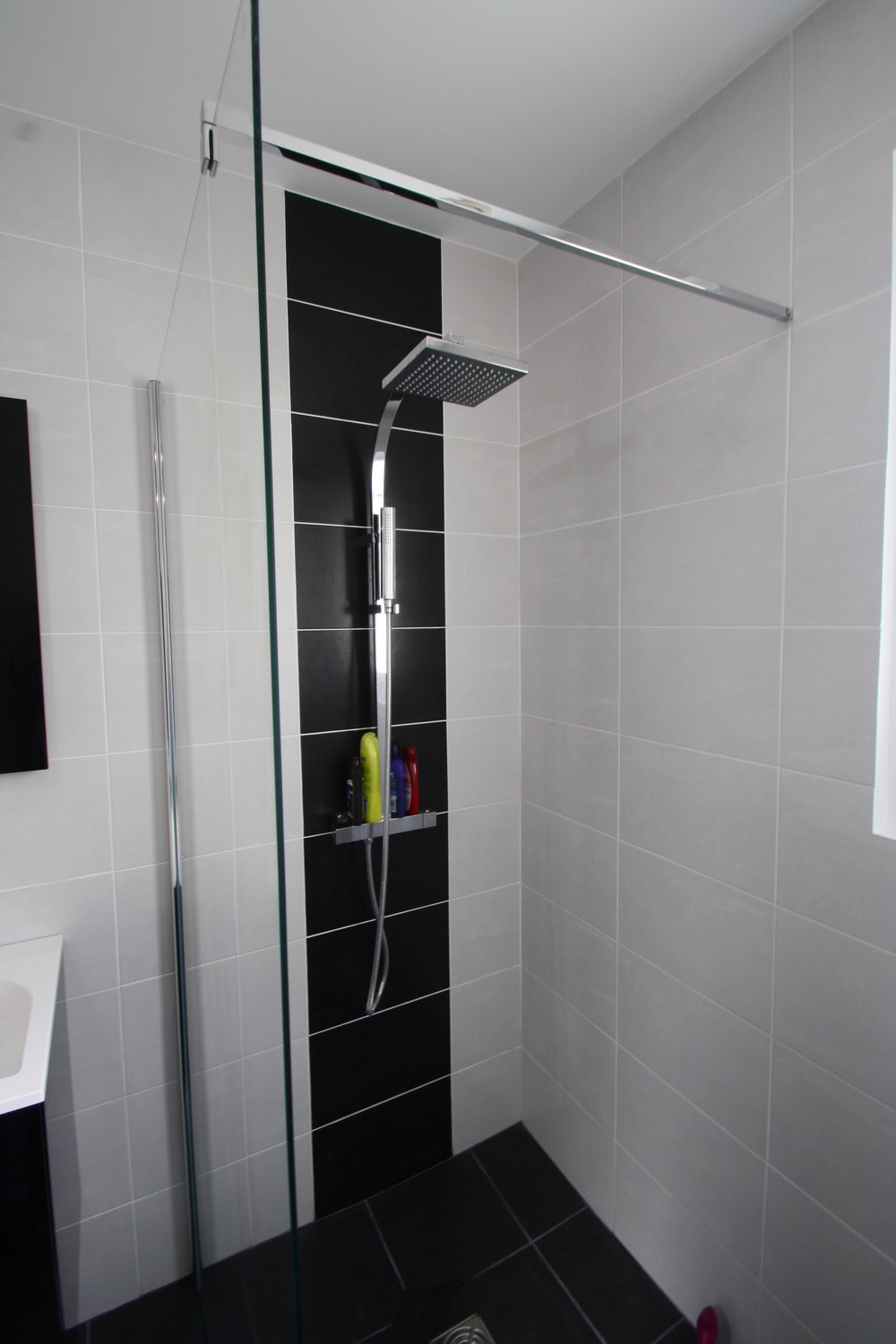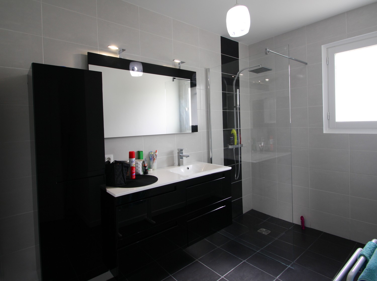 Une salle de bainnoire et blanche.Lassés d'une salle de bain ancienne et peu fonctionnelle, les clients nous ont missionné pour réaliser un espace mieux distribué dans une ambiance sobre. |